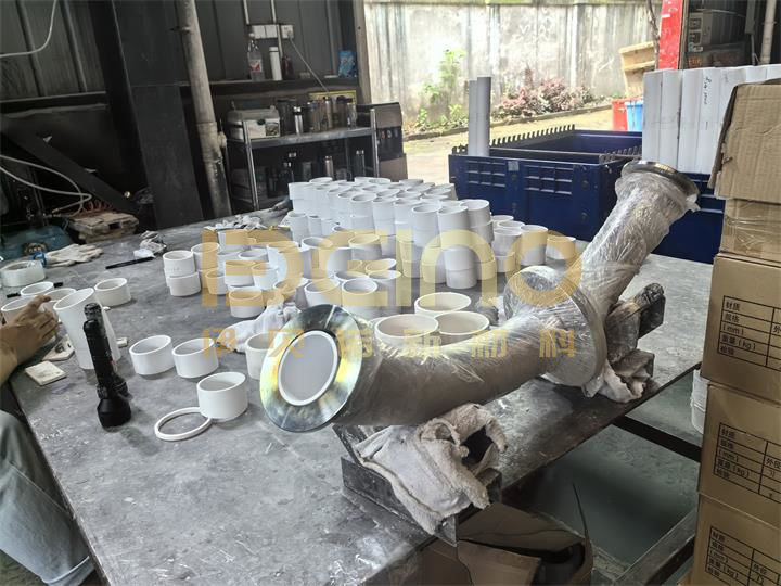 De met keramische mouw beklede leiding en de slijtvaste leiding worden verpakt met een stalen skeletverpakking met plastic doppen aan beide uiteinden om te voorkomen dat stof en regen de leiding binnendringen. Dit zorgt voor de esthetiek van het product en garandeert dat de leiding binnenin wordt beschermd tijdens transport.